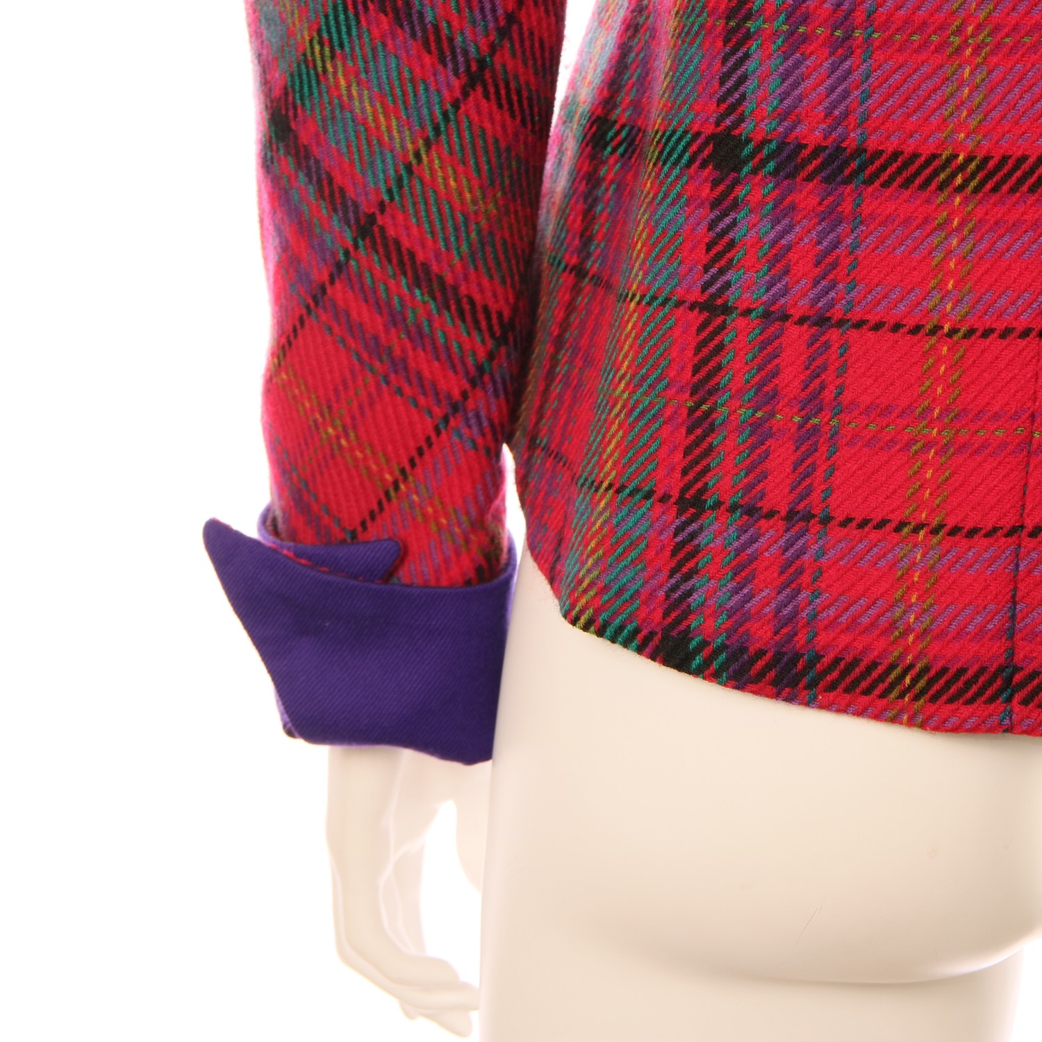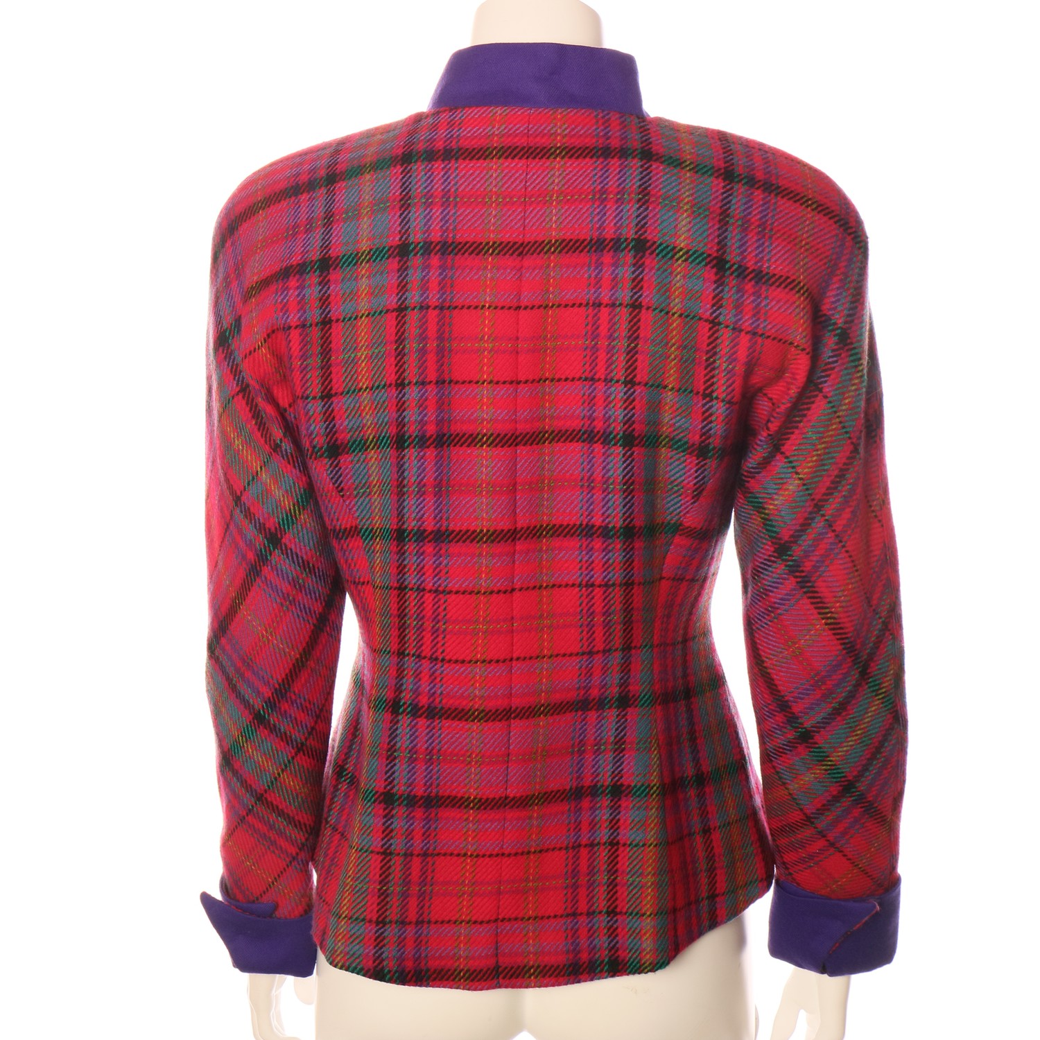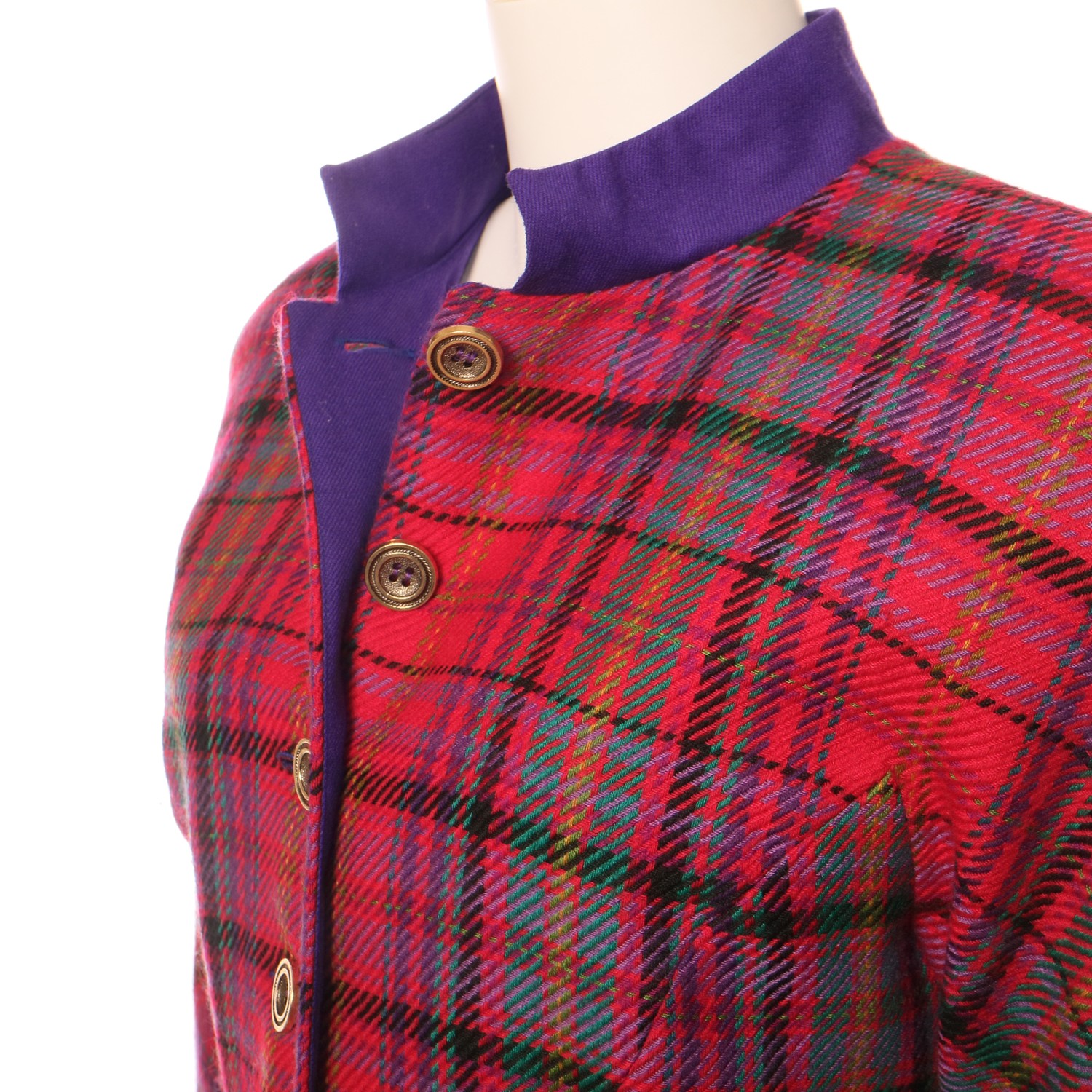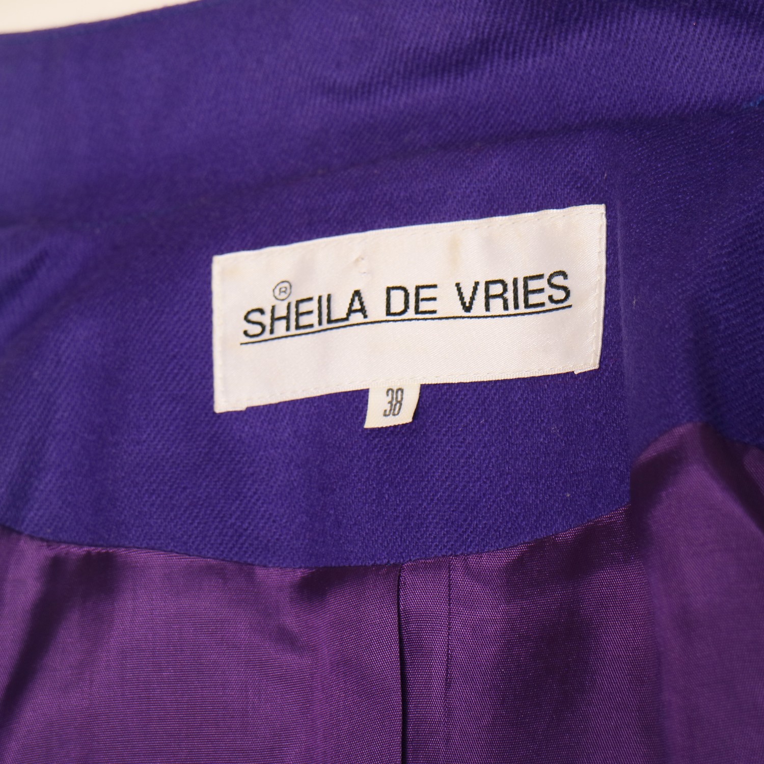 Very classy, bright tailored, vintage jacket designed by Dutch designer Sheila de Vries, in woolen chechs with round, padded shoulders and kimono sleeves. Six 'old golden' buttons. contrast purple mandarin collar and contrast purple folded cuffs. Rounded hem.
