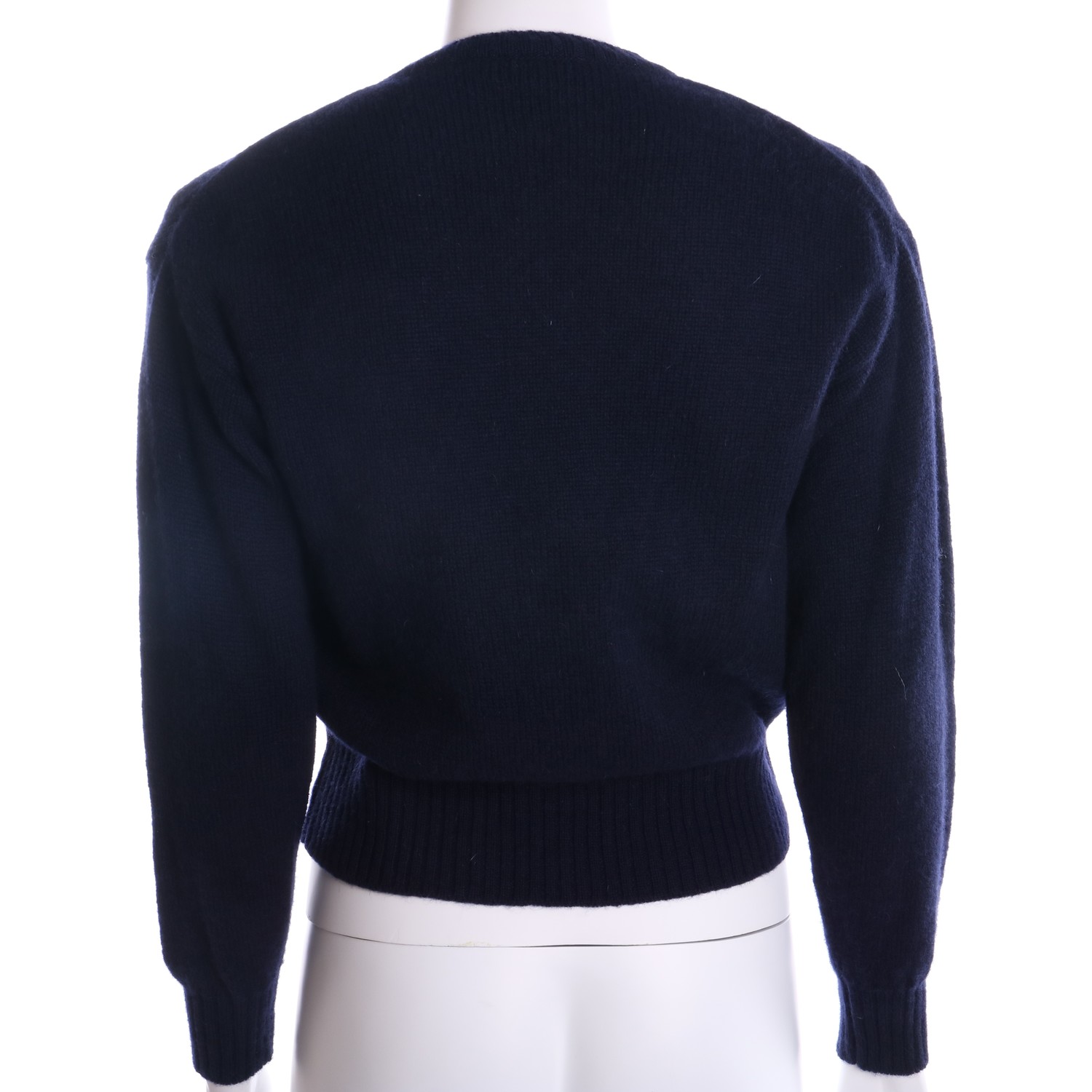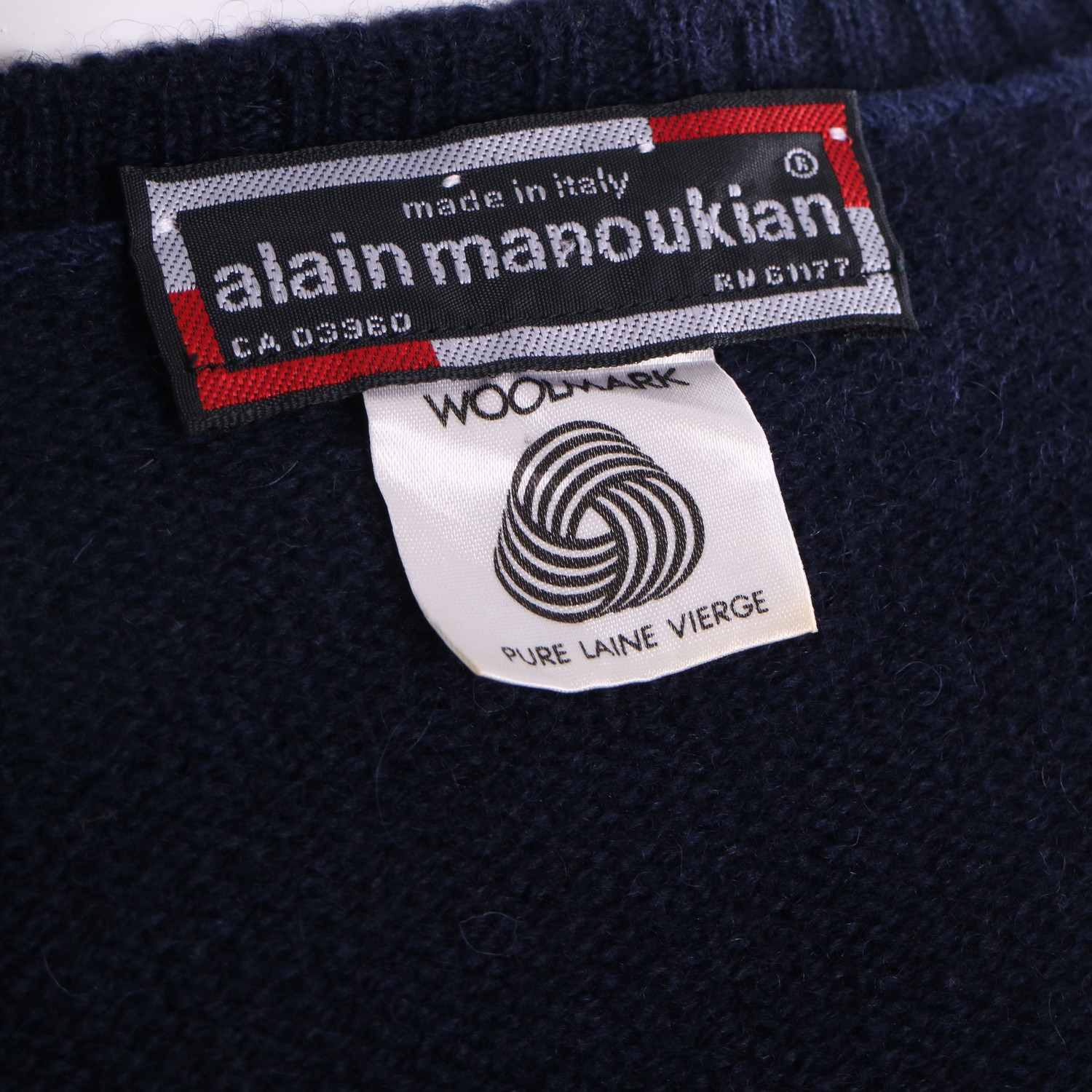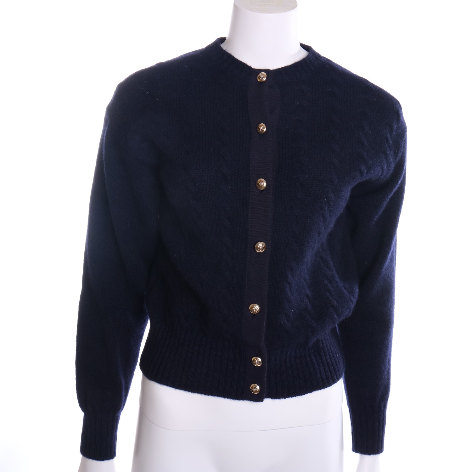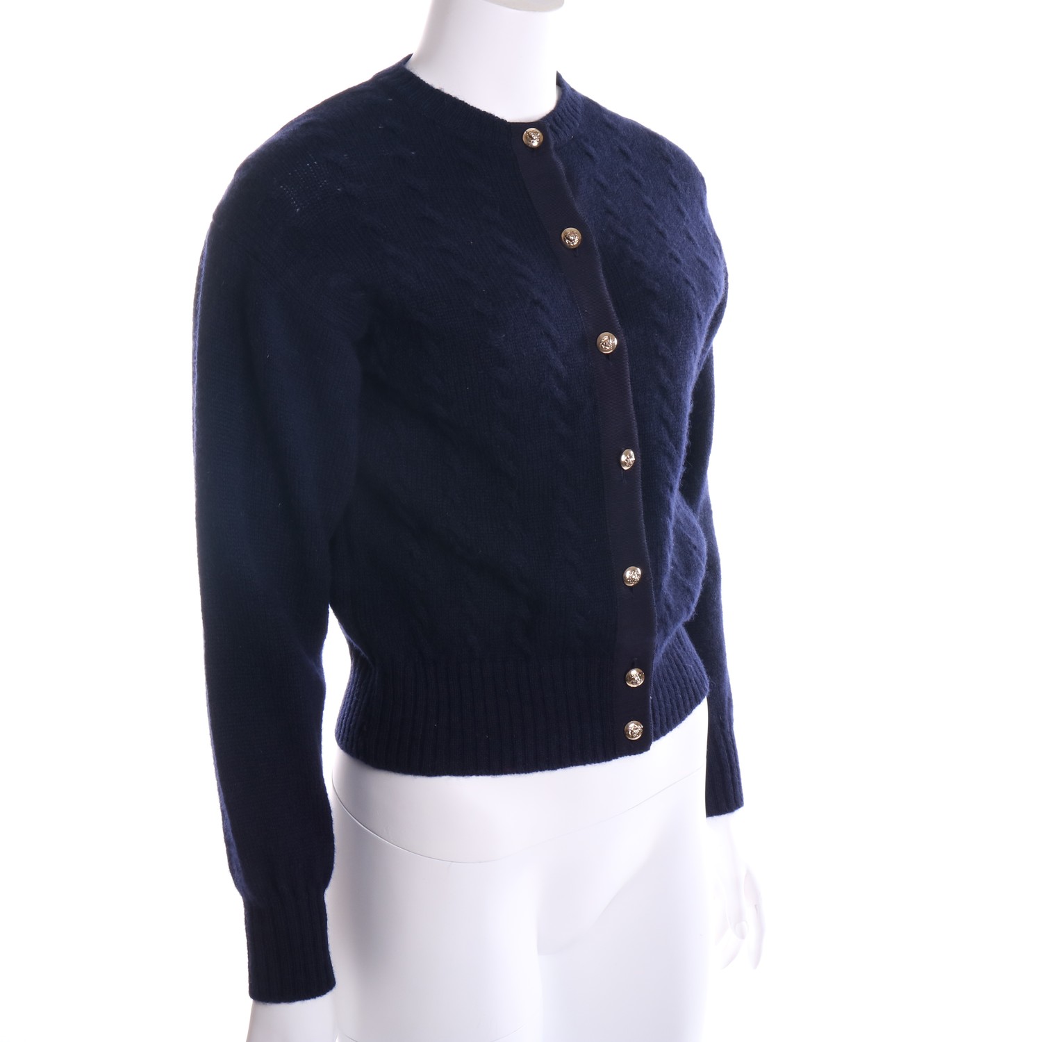 Classic, round neck, cable knit vintage cardigan designed by Alain Manoukian with cuffs and hem ribbing at hip length with 7 gold coloured buttons.