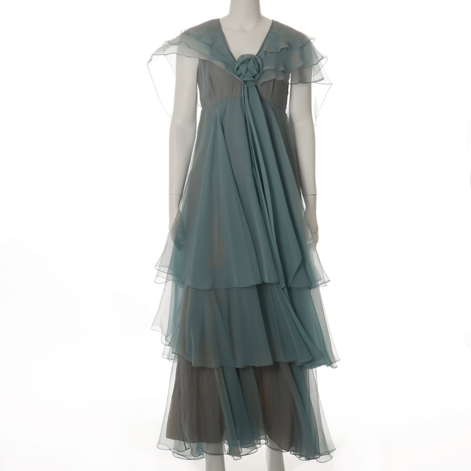 This V-neck, sleeveless tiered dress has three layered ruffled cape collar.
