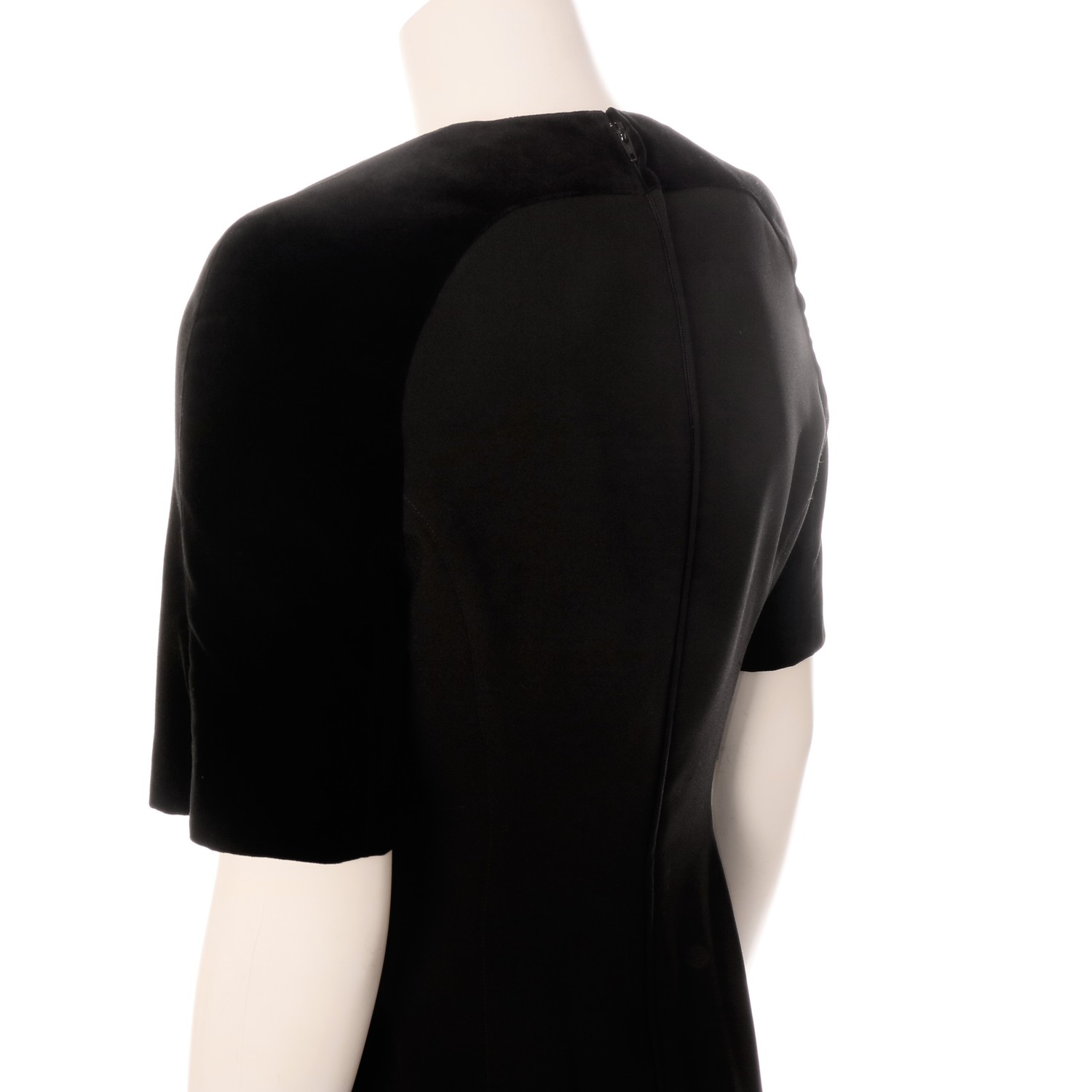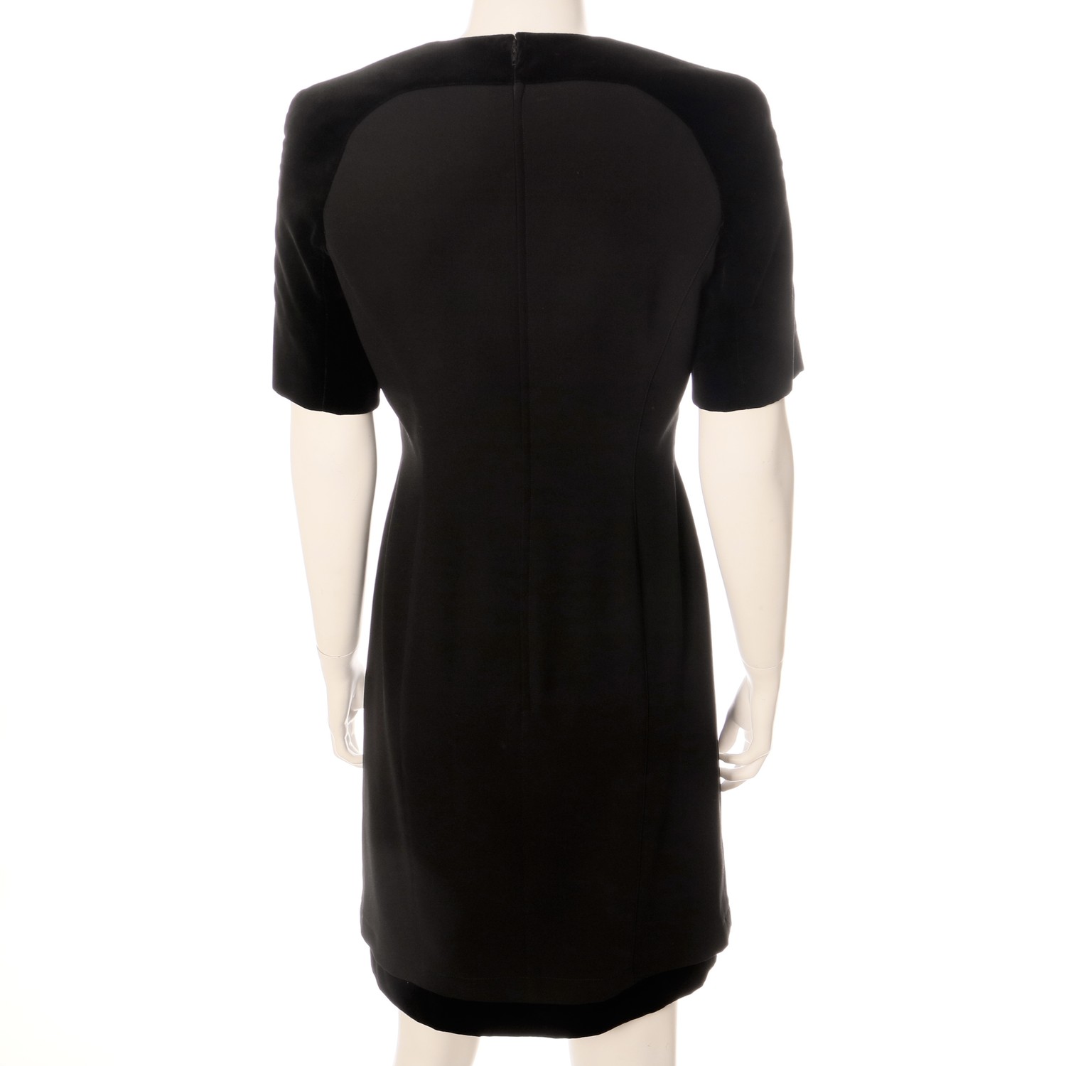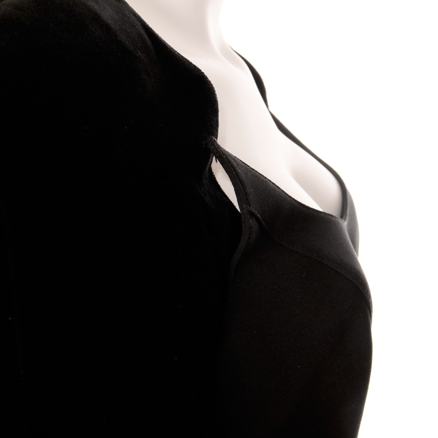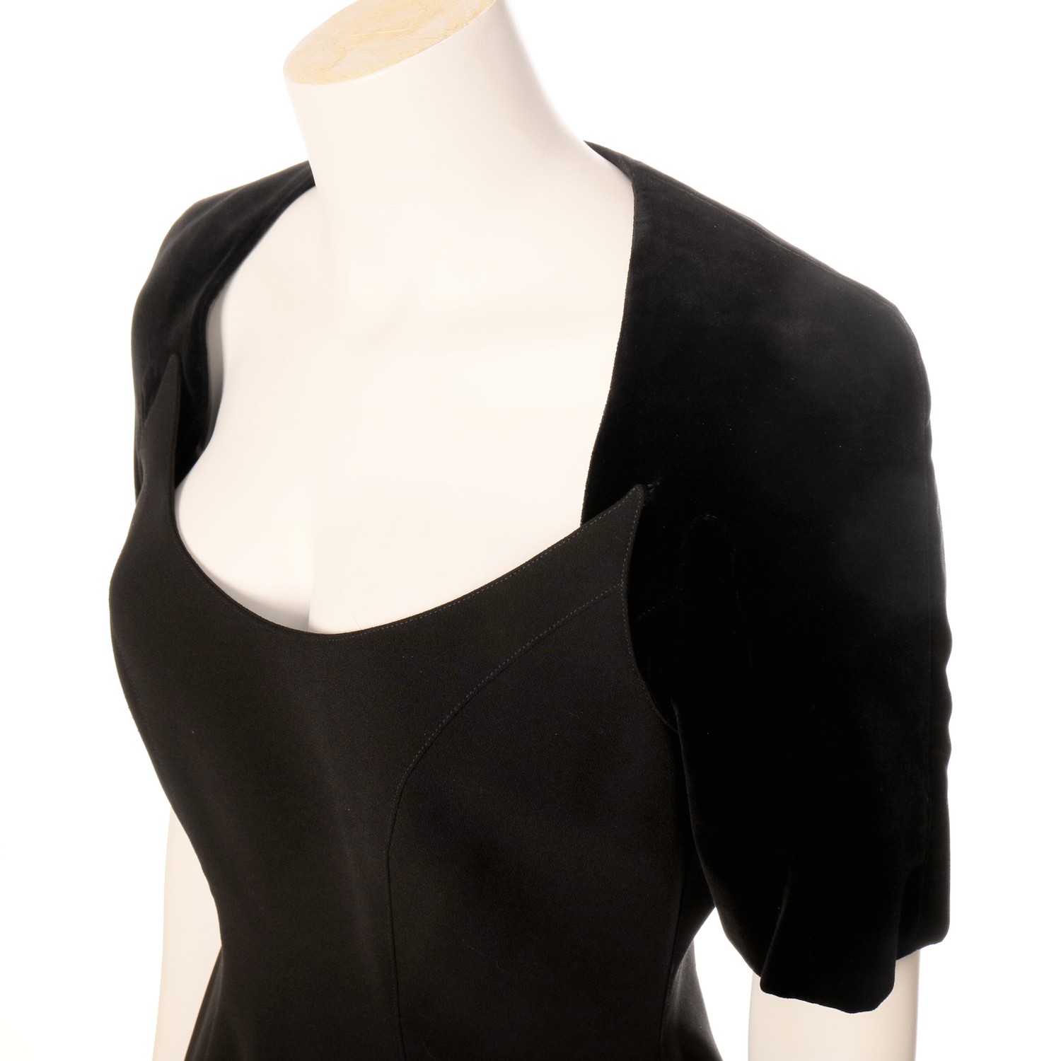 Very elegant 'little black' vintage cocktail dress designed by Thierry Mugler in princess shape with velvet raglan sleeves in the back and in the front velvet kimonosleeves with rounded gored inset. Round shaped neckline with pointed ends over the velvet sleeves so it looks like the sleeves are at the same time a bolero under a strapless dress. Velvet hem in dress.