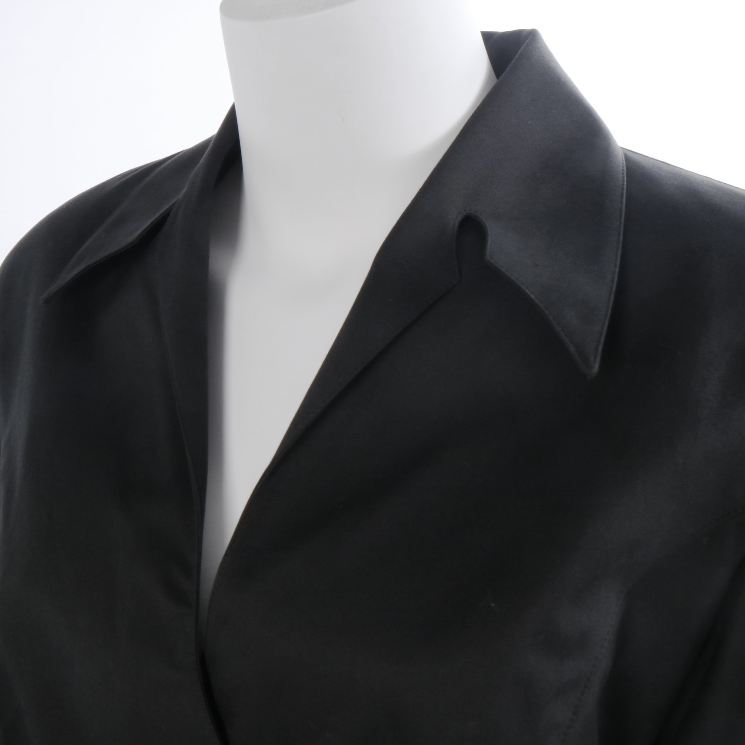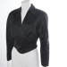 Waistline length with a-symmetrical closure with zipper, cap sleeve with side panel, fantasy shawl collar with lapel in one piece.