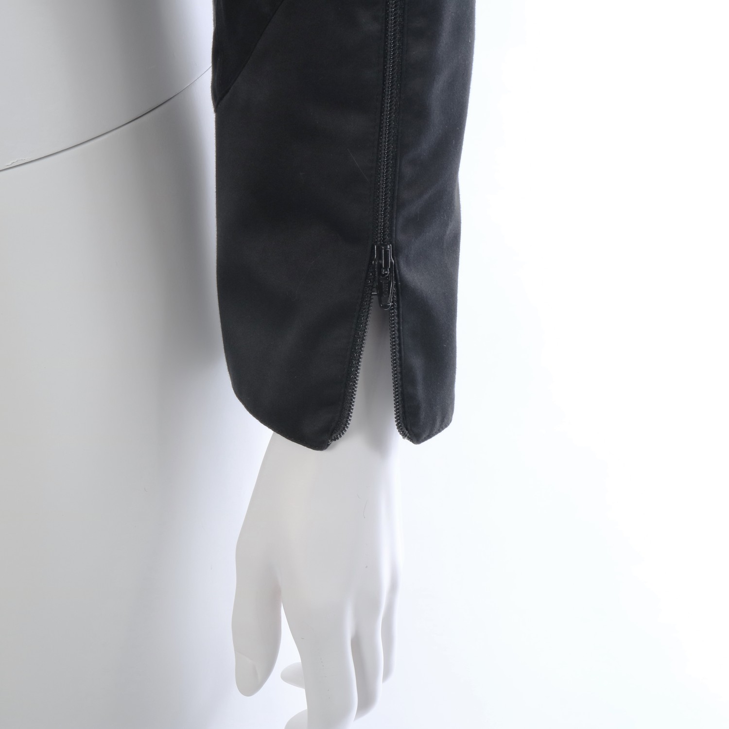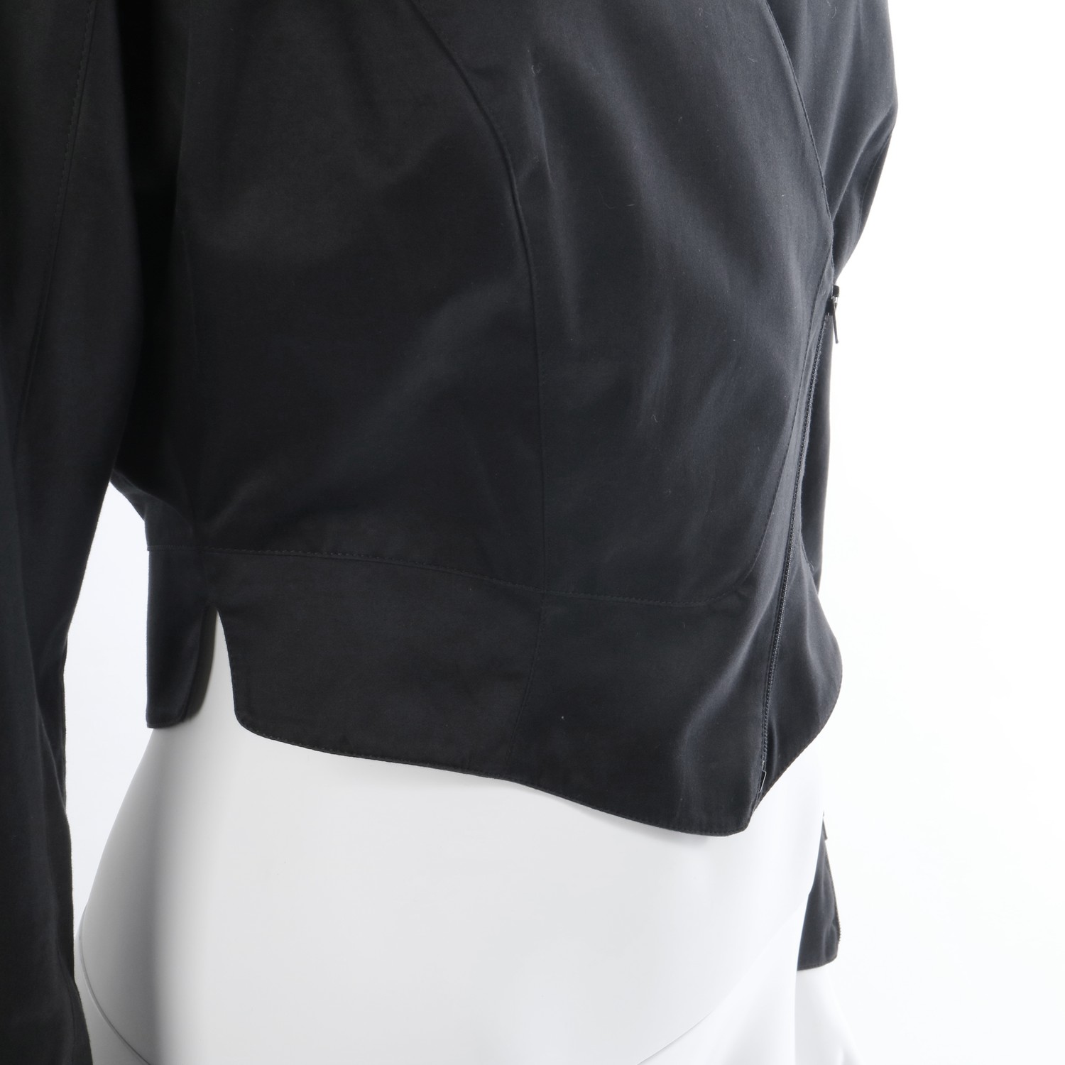 Zipper in hem of sleeves. Jacket is longer in the front and in the back than the sides. The sides have round shaped slits.