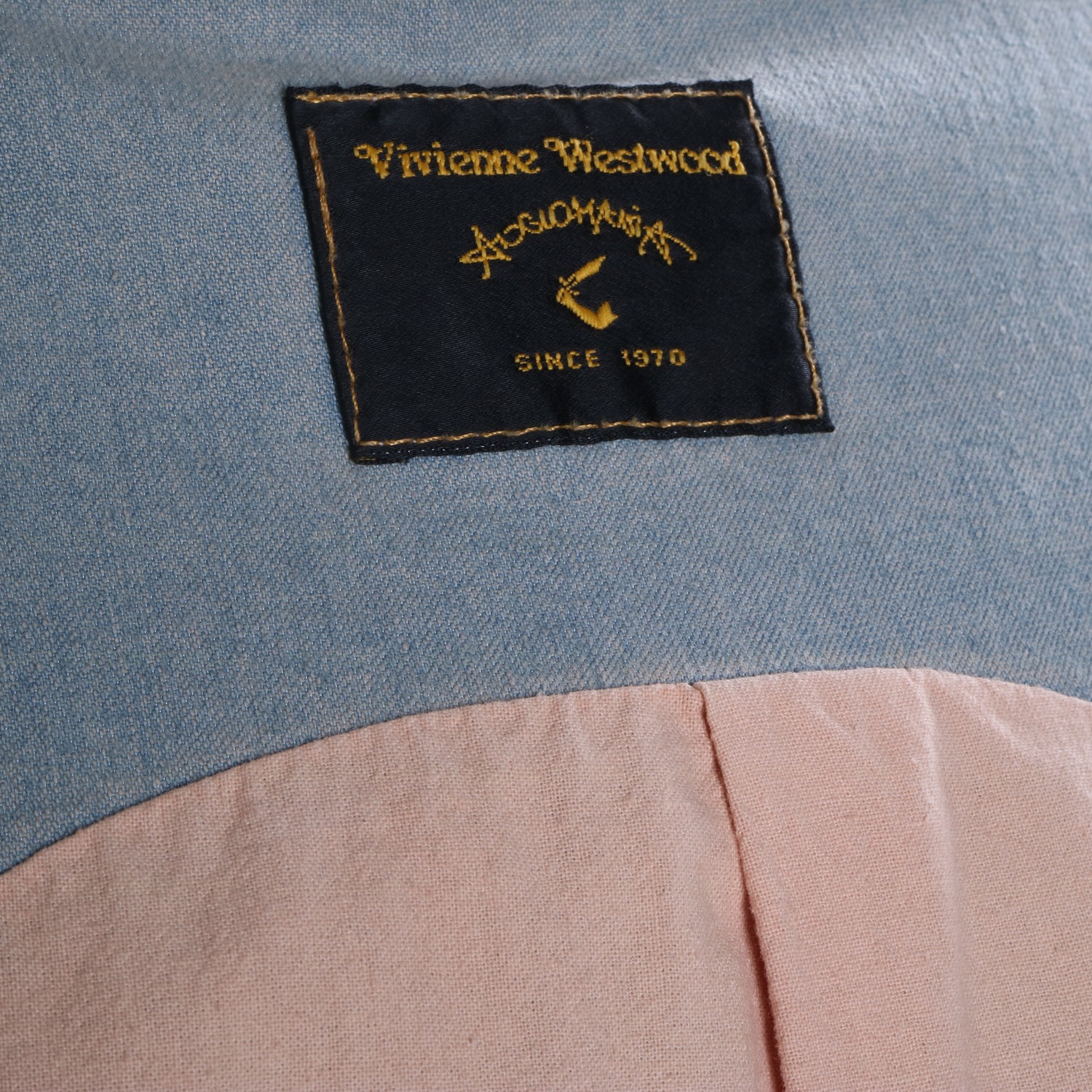 Beautiful, vintage, off shoulder jacket, of faded denim, designed by Vivienne Westwood (Anglomania) with very deep cleavage.